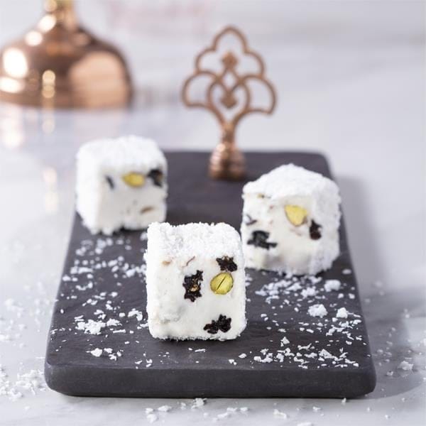 Sultan Lokum – een oosterse lekkernij met een luxe twist! Deze variant combineert drie heerlijke smaken: zoete rozijnen, knapperige pistachenoten en een zachte laag kokos. Het resultaat is een verfijnde traktatie die perfect past bij speciale gelegenheden of gewoon als verwenmomentje.